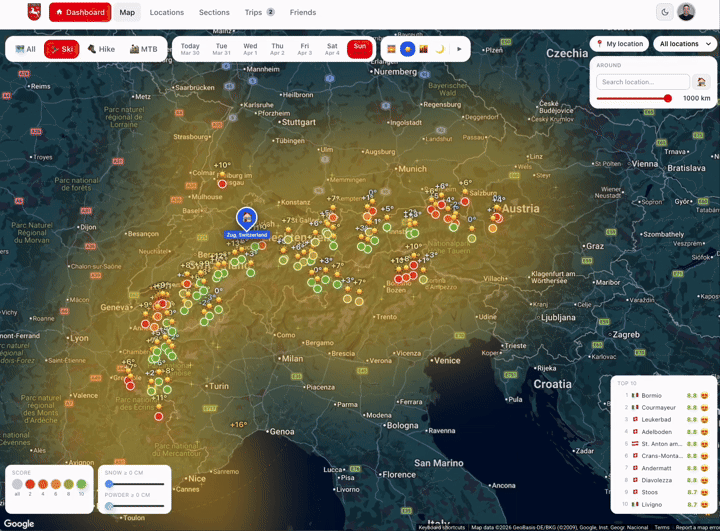 The Alps span 1,200 km across 8 countries and host over 600 ski resorts. Ski Kavallerie tracks them all — giving you live weather scores, powder alerts and a complete map of every mountain destination in a single app.